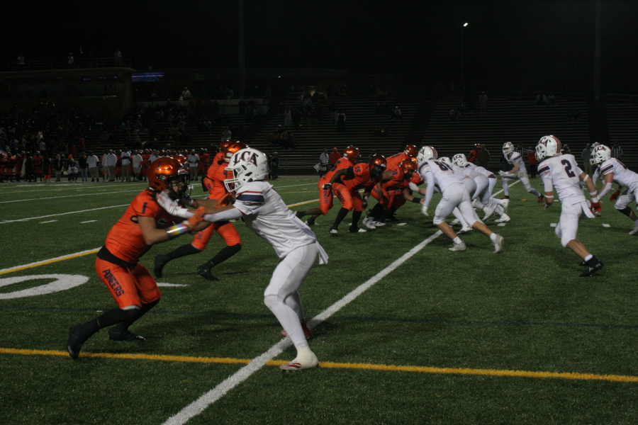 On this cold Friday night, the Pioneers and Bulldogs battled tooth and nail. The Bulldogs used their power running game to establish a 14-0 lead at halftime on the strength of two touchdowns by Davidson. Heritage struggled with the size and athleticism of LCA. The defense were on display and made multiple stops to dissolve several offensive drives by both squads.